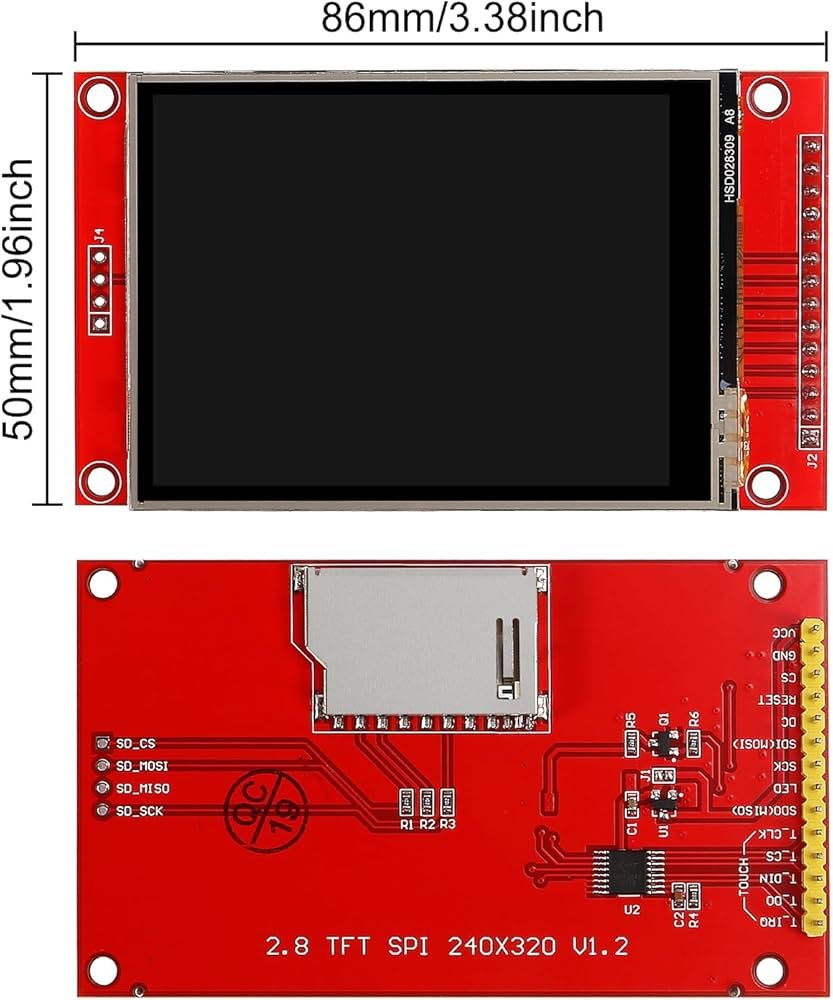 f you have outgrown the small monochrome OLED displays, this is the next big step. This 2.8-inch module offers a full-color 240×320 pixel display, perfect for showing graphs, photos, or complex control panels. It features a Resistive Touch Screen, meaning you can press buttons on the screen with the included stylus or your fingernail. It communicates via the SPI interface, which is fast enough for smooth graphics but only requires a few pins on your Arduino or ESP32. It even includes a full-sized SD Card Slot on the back, allowing you to load bitmap images directly from a memory card.