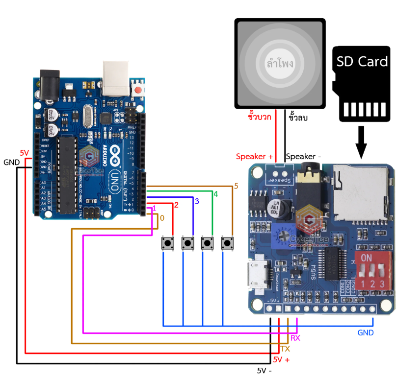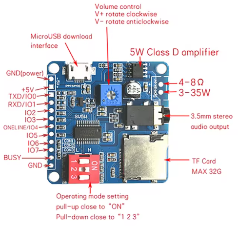 & Free ShippingThe smart sound engine. A high-quality MP3/WAV player with a built-in 5W amplifier. Supports 7 operating modes (controlled via the red DIP switch), including direct button triggers, UART serial control, and MP3 mode.